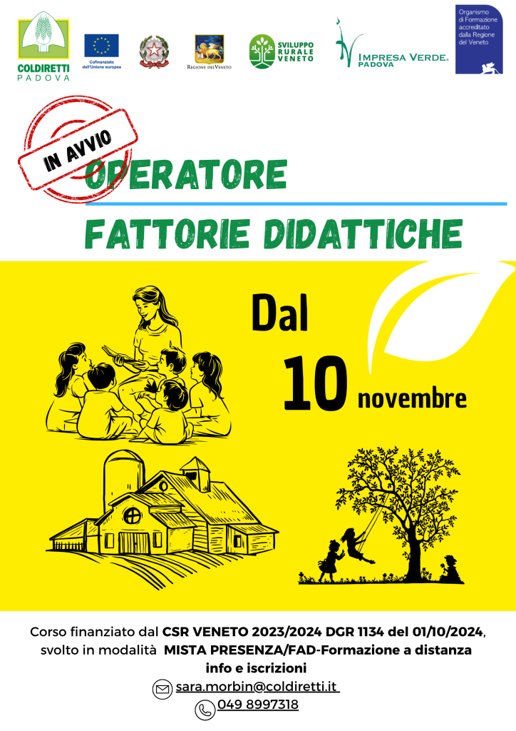 Impresa Verde Padova Srl, organismo di formazione accreditato dalla Regione Veneto, comunica che a partire dal 10 novembre prossimo è in  partenza il corso di Fattorie didattiche. L'attività è finanziata dal CSR Veneto 2023/2027 e ed è rivolta esclusivamente a titolari, partecipi familiari, coadiuvanti, dipendenti di attività agricola. La durata è di 30 ore, in modalità mista, sia in presenza che on line, l'attestato verrà rilasciato con Frequenza minima di presenza pari all'80% delle ore previste. Maggiori informazioni sul volantino qui sotto