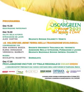 Ottanta i concorrenti in gara, tutti diplomati o laureati. Una media di 20 ettari ciascuno pari a 1600 ettari di campagna presidiata e salvaguardata. Allevano, coltivano e soprattutto innovano. Sono i candidati dell’Oscar Green premio che ogni anno Coldiretti dedica alle nuove generazioni dei campi. La cerimonia finale regionale della XV^ edizione si terrà in terra palladiana nella Villa Godi Malinverni di Lugo di Vicenza DOMANI 7 OTTOBRE ALLE ORE 15.30. “Sono i talenti del territorio – commenta Alex Vantini delegato di Giovani Impresa – gareggiano con progetti imprenditoriali legati alla tradizione con uno spiccato indirizzo moderno”. Suddivisi in sei categorie: Campagna Amica, Impresa 5.Terra, Creatività, Fare Rete, Noi per il sociale, Sostenibilità si confronteranno su vari ambiti come quello del risparmio energetico, dell’alta tecnologia, dei servizi sociali e della filiera corta. “Un’ esplosione di creatività _ aggiunge Alex Vantini – che solo la campagna può stimolare”. La cerimonia sarà anticipata da talk show moderato dalla giornalista Nicoletta Masetto sul tema:” Il valore del bene terra nella transizione ecologica”. Interverranno Don Giorgio Bozza docente Università teologica del Triveneto, Elena Donazzan assessore regionale istruzione formazione e lavoro e Veronica Barbati delegata nazionale Giovani Impresa Coldiretti. A seguire l’inizio ufficiale delle premiazioni che sarà salutato da Nicola Finco Vice presidente del Consiglio Veneto. Oltre ai vincitori saranno proclamati anche i finalisti che rappresenteranno il Veneto nella sfida nazionale. L' iniziativa è sostenuta dal Consorzio AgriNordEst, da ForGreen (compagnia che si occupa di sviluppo sostenibile e della vendita di energia pulita), dal Gruppo Maschio Gaspardo (una multinazionale leader nella produzione di attrezzature agricole), dal Gruppo Cattolica Assicurazioni, da Sergio Bassan uno dei maggiori concessionari John Deere in Italia e da BRD Biogas Refinery Development srl di Cittadella (PD).